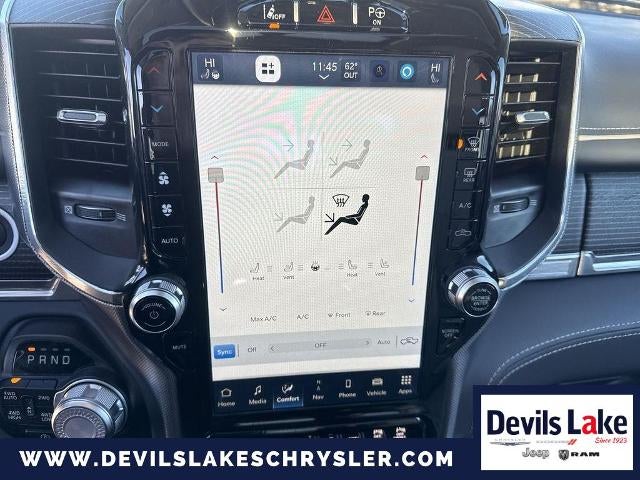 Quick Order Package 27M Limited. Limited Level 1 Equipment Group: Adaptive Cruise Control with Stop and Go; Surround View Camera System; Head Up Display; Parallel and Perp Park Assist with Stop; LED CHMSL Lamp; Tailgate Ajar Warning Lamp; Ventilated Rear Seats; Pedestrian Emergency Braking; Digital Rearview Mirror; Lane Keep Assist. Off Road Group: Off Road Decals; Off-Road Information Pages; Steering Gear Skid Plate; Front Suspension Skid Plate; Raised Ride Height; 275/55R20 OWL All-Terrain Tires; Front Extra Heavy Duty Shock Absorbers; Rear Extra Heavy Duty Shock Absorbers; Full Size Spare Tire; E-Locker Rear Axle; Transfer Case Skid Plate; Fuel Tank Skid Plate; Hill Descent Control; All Plant-Installed Decals. Limited 10th Anniversary Edition: Multi-Function Tailgate; Harman/kardon 19 Speaker Premium Sound; Rotary Shifter-Jeweled; Truck Bed Cargo Divider; Suede Headliner; Premium Quilted Leather Bucket Seats; Instrument Cluster Theme 8; MOPAR 4 Adjustable Cargo Tie-Down Hooks; Tailgate Ajar Warning Lamp; MOPAR Deployable Bed Step Center Mount; MOPAR Bright Pedal Kit. Body Color Bumper Group: Body Color Front Bumper; Body Color Rear Bumper with Step Pads. Dual-Pane Panoramic Sunroof. Multi-Function Tailgate. RamBox Cargo Management System. Tri-Fold Tonneau Cover. E-Locker Rear Axle. 33 Gallon Fuel Tank. Diamond Black Crystal PC. **Equipment listed is based on original vehicle build and subject to change. Please confirm the accuracy of the included equipment by calling the dealer prior to purchase.**